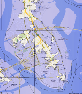 I began researching Charleston the old-fashioned way…the way I learned to do it at the St. Charles archives…the earliest timeframe first. Before settling on my block in Charleston as my home base, I began to accumulate copies online of old maps. I am going to share an old one here out of chronological sequence (and will show it again later) because it shows the limited usable space that Charleston had to grow a town on due to the high tide consequence of living in the Low Country. And, coincidentally, just now, I thought of a quote to use from a great book I will quote from often, Lowcountry at High Tide (1):