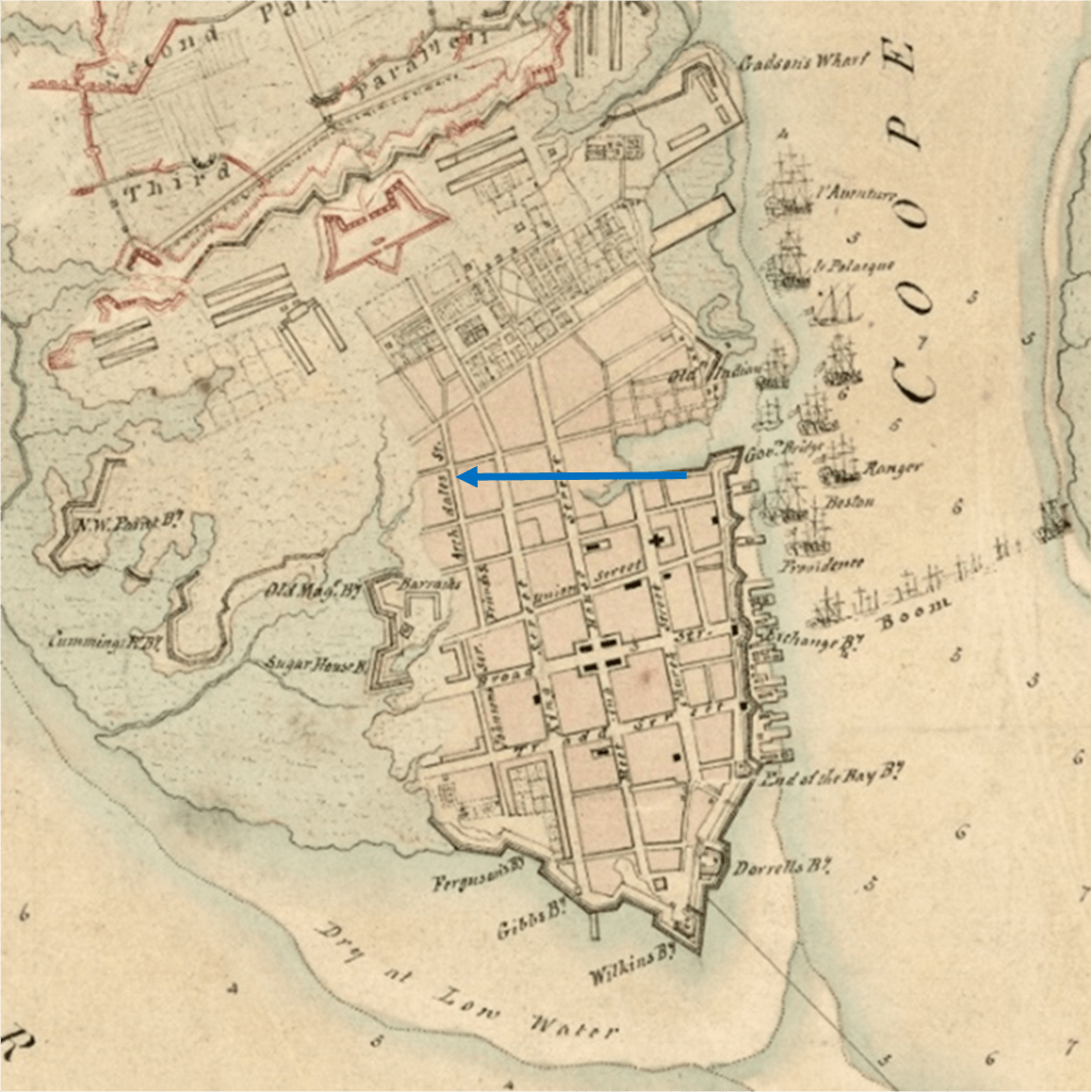 - (2) Map: 1780 Investiture Charleston Walled City…a ca. 1780 British map now among the collections of the U.S. Library of Congress from the sites’ 5 April 2016 post Occupied Charleston 1780-1782 https://walledcitytaskforce.org/page/3/