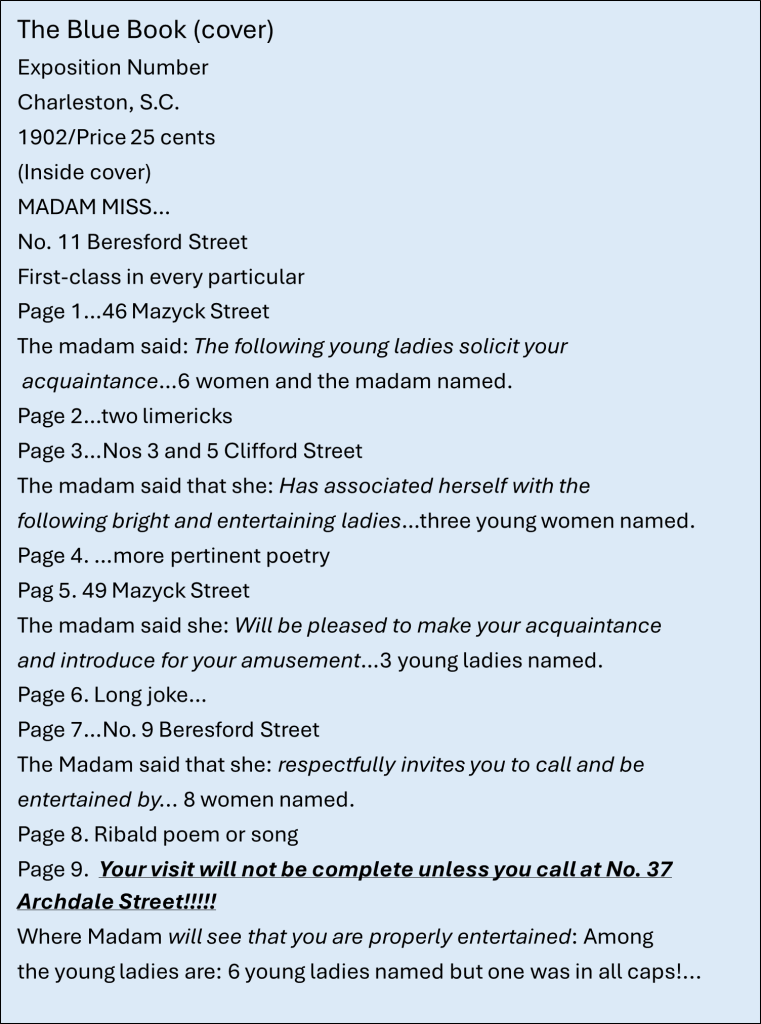 In 1901, a huge Exposition was held in Charleston and “hundreds of thousands” of visitors came to town. The ladies wanted to share in the wealth coming into the city, so they put out a book advertising their bordellos and naming the women at each place…though I chose not to include their names…because of family genealogy searches. You can get Mark Jones’ book if you want them.