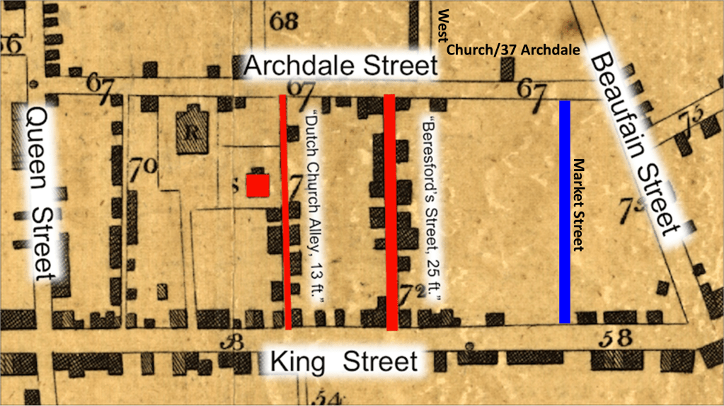 This was not a passing phase. The brothels did not go away after the British occupation. Think about it. The reputation of the neighborhood could well be the reason that the St. Andrews group who built the wood structure on Archdale in 1814 moved. The price of land would have been low being on the very street that had town on one side and outskirts on the other…and Market Street that consistently had a bad reputation forever because of the wharfs and the market…that dead ended into Archdale right at my block. And may be why the St. Andrews group moved out again. And why Third Presbyterian Church moved in as a brand-new church. Reverend Dana’s remembrances of the first 25 years were dominated by money concerns, and they moved out as soon as they were financially able to buy land in a better location.
